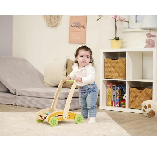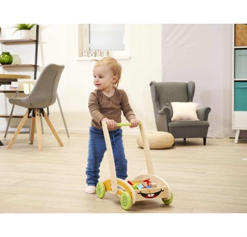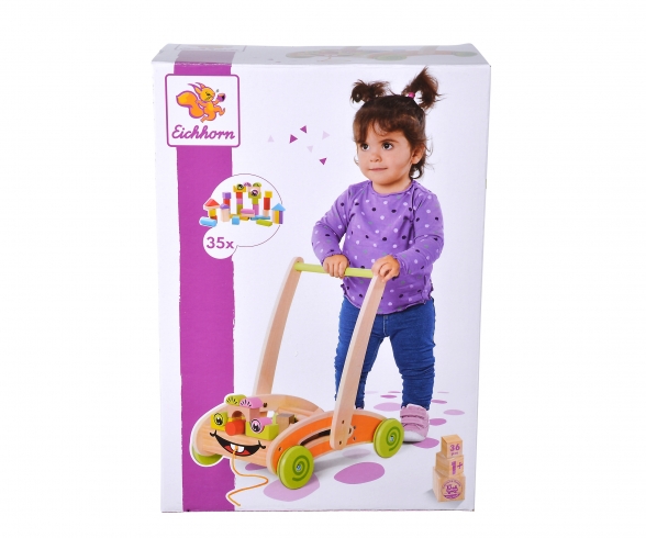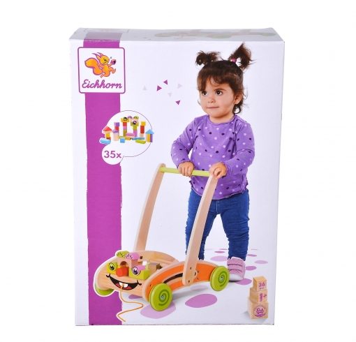 . Il design ingegnoso, con un’altezza del manico di circa 44 cm, sostiene i bambini mentre muovono i primi passi e offre anche uno spazio per riporre i 35 blocchi da costruzione stampati contenuti nel carrello. Se si posizionano i mattoncini sulla parte anteriore del carrello nell’ordine giusto, si crea una faccia buffa. Il carrellino può anche essere tirato con la corda.