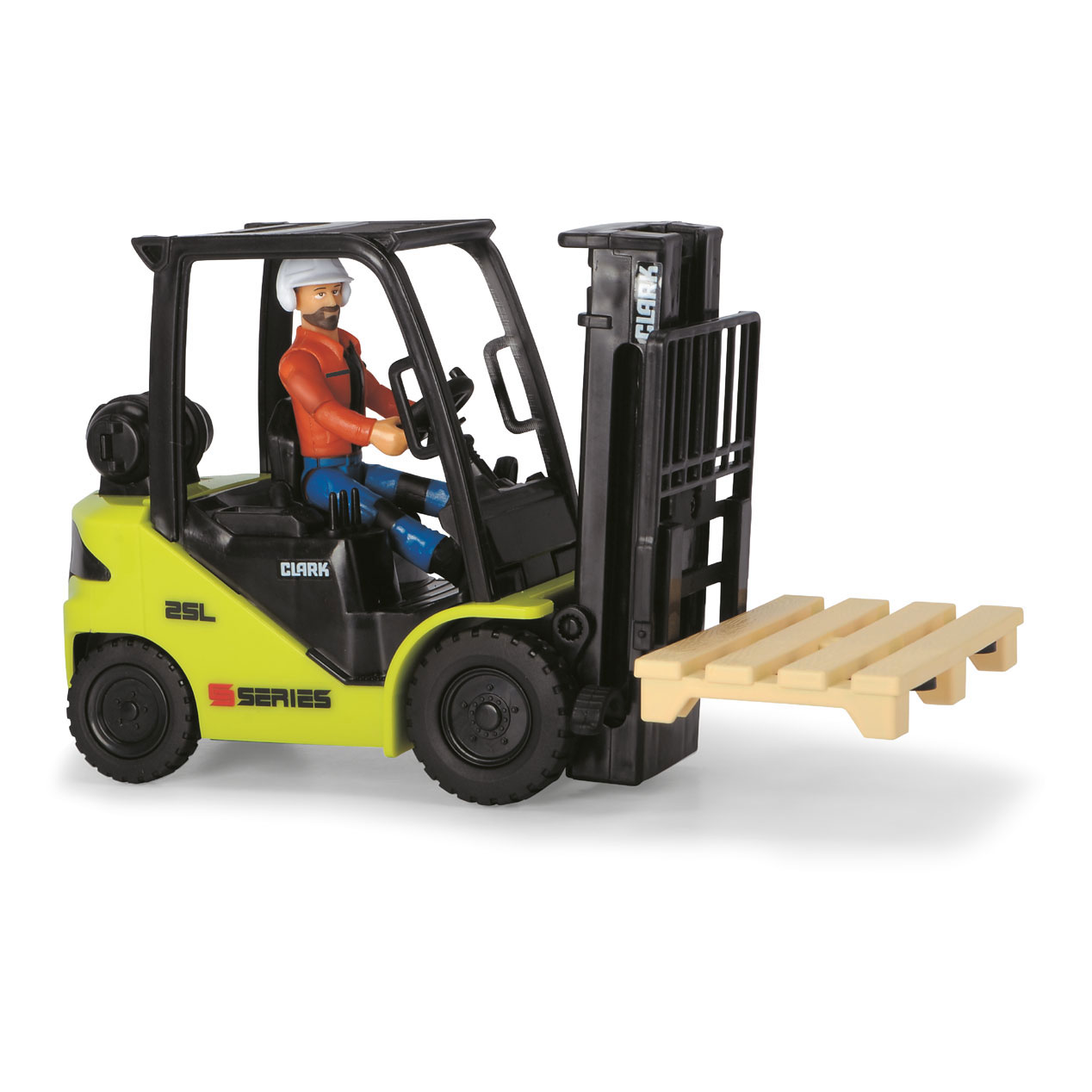 Set di carrelli elevatori Dickie Toys: una macchina per il trasporto delle merci. Il carrello elevatore a ruota libera Clark S25 di Dickie Toys si muove nell’asilo nido con la stessa velocità e manovrabilità di un vero carrello elevatore in un negozio di bricolage.