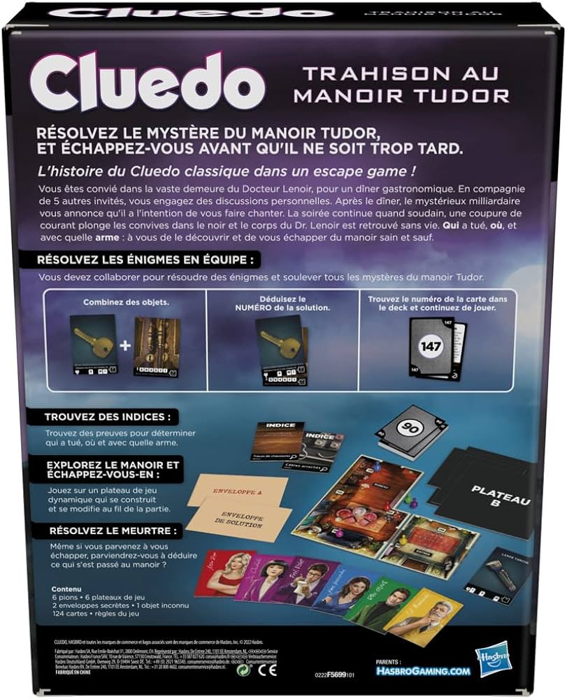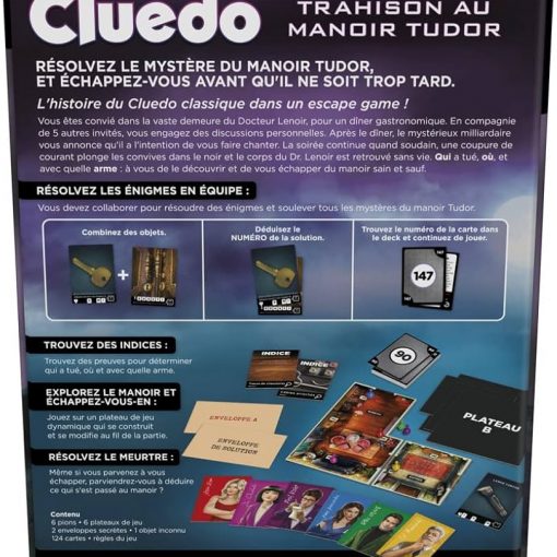Ti stai godendo la serata come ospite nella Villa del Dottor Black quando all’improvviso senti un urlo, le luci si spengono e ti trovi davanti al cadavere del Dottor Black! Tu e gli altri giocatori dovrete collaborare per fuggire da Villa Tudor e riuscire a stabilire chi ha ucciso il Dottor Black, in quale stanza e con quale arma. Il gioco di misteri ed enigmi combina gli intrighi e i personaggi dell’iconico gioco di crimine e mistero Cluedo con un’avvincente esperienza di gioco in versione Escape Game. I giocatori muovono le proprie pedine sul tabellone che viene costruito stanza dopo stanza e pescano carte, risolvono puzzle, sbloccano nuove stanze e scoprono indizi. Dopo essere fuggiti, i giocatori riesaminano gli indizi per formulare l’accusa corretta e vincere la partita! Un entusiasmante mistero risolvibile una sola volta.