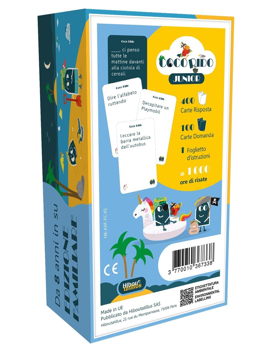 La versione Junior del party game più irriverente del mondo….con meno irriverenza! XD Coco Rido Junior è un party game super divertente da giocare in famiglia! Un giocatore prende una carta domanda, la legge ad alta voce e gli altri giocatori scelgono tra le 11 carte risposta del proprio mazzo, quella che, collegata alla carta base, risulterebbe più divertente, assurda, apprezzabile. Quello stesso giocatore rilegge poi la carta domanda completandola con le carte risposta fornite dagli altri giocatori e attribuisce arbitrariamente un punto a quella che ritiene avere l’effetto migliore. Il ruolo di narratore passa così al vincitore del turno. Il giocatore che arriva per primo a 5 punti vince la partita.Tutto qua! Si assicurano grasse risate!
