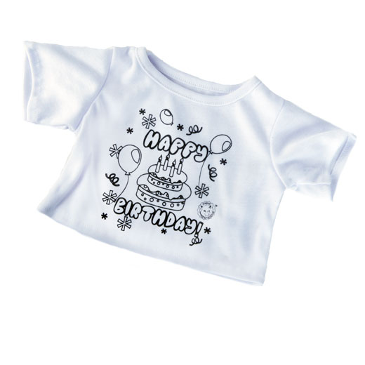 Questa adorabile t-shirt bianca con stampa Happy Birthday Γ¨ pensata per essere colorata a mano β il modo perfetto per rendere unico il look del tuo peluche.