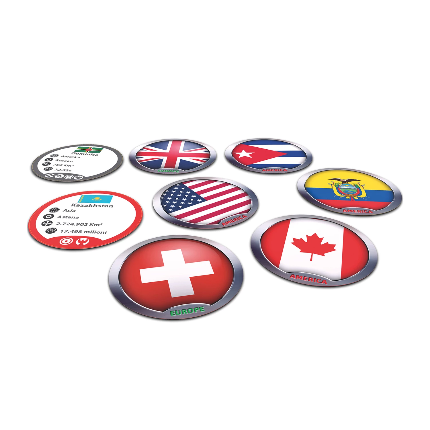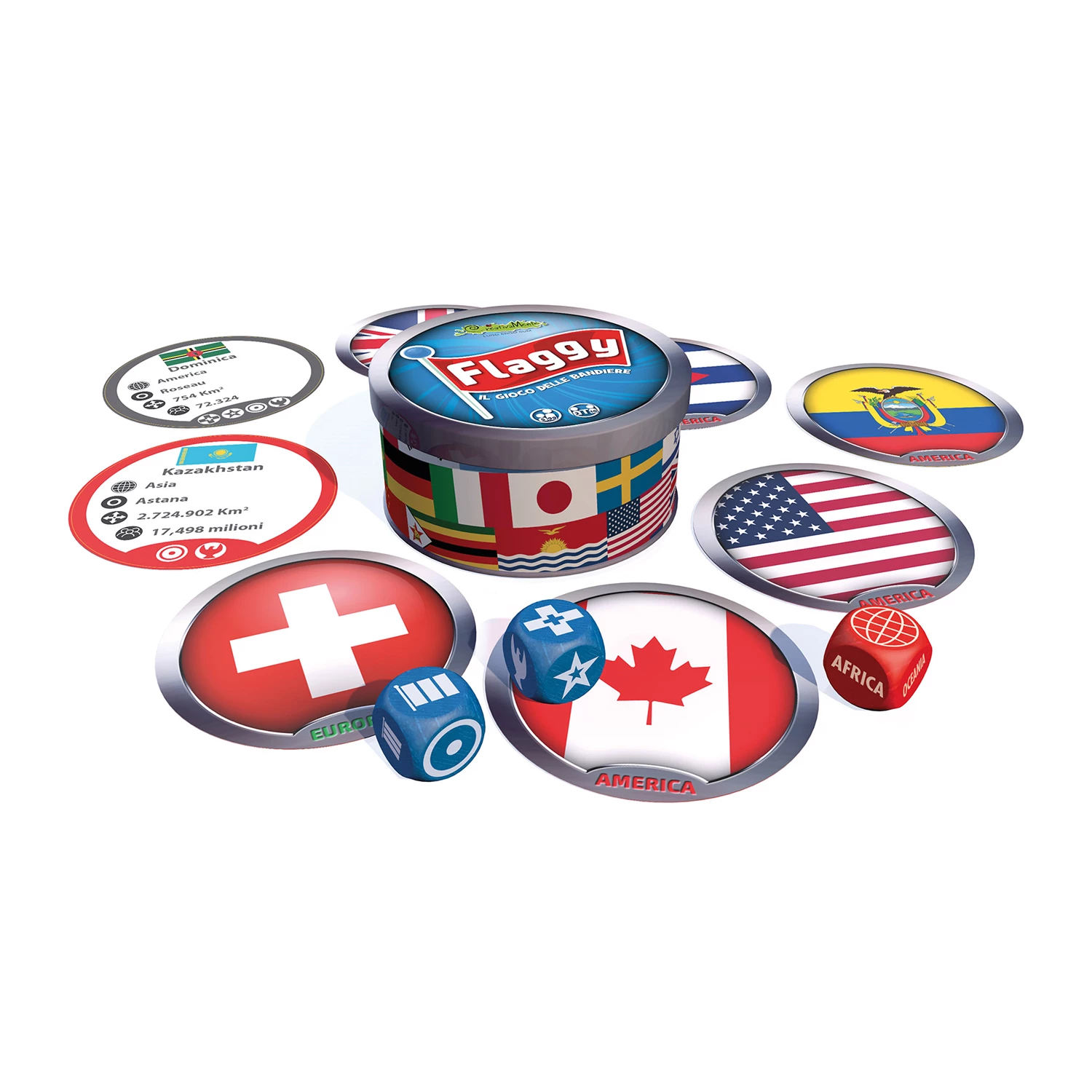 FLAGGY è il gioco delle bandiere, dinamico, divertente ed educativo. La scatola contiene 3 dadi in legno e 48 carte tonde, con la bandiera su un lato e sull’altro alcune informazioni di quello stato: la capitale, il continente, la superficie e la popolazione. Si possono fare 5 diversi giochi, grazie ai quali imparerete a riconoscere le 48 bandiere degli stati più importanti al mondo e a memorizzarne la capitale e il continente. Oltre all’aspetto educativo, tutti i giochi stimolano la logica, la concentrazione e la percezione visiva.