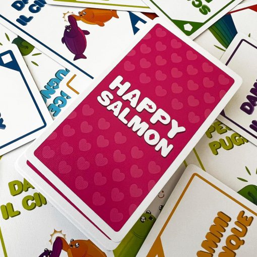 Happy Salmon è un gioco di carte velocissimo che fa muovere e ridere tutti in meno di due minuti. Quindi fate un po’ di spazio, liberatevi delle sedie e, se il vostro battito supera i 120 bpm, probabilmente state giocando nel modo giusto.