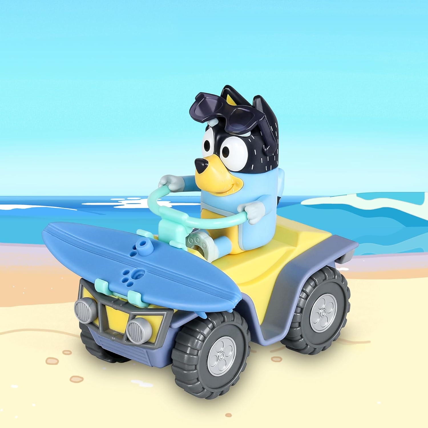 Immergiti nell’avventura con il veicolo da spiaggia di Bluey: Riprodotto fedelmente questo veicolo da spiaggia permette a papà Bandit di guidare il quad o cavalcare le onde con la tavola da surf per momenti di divertimento senza fine.