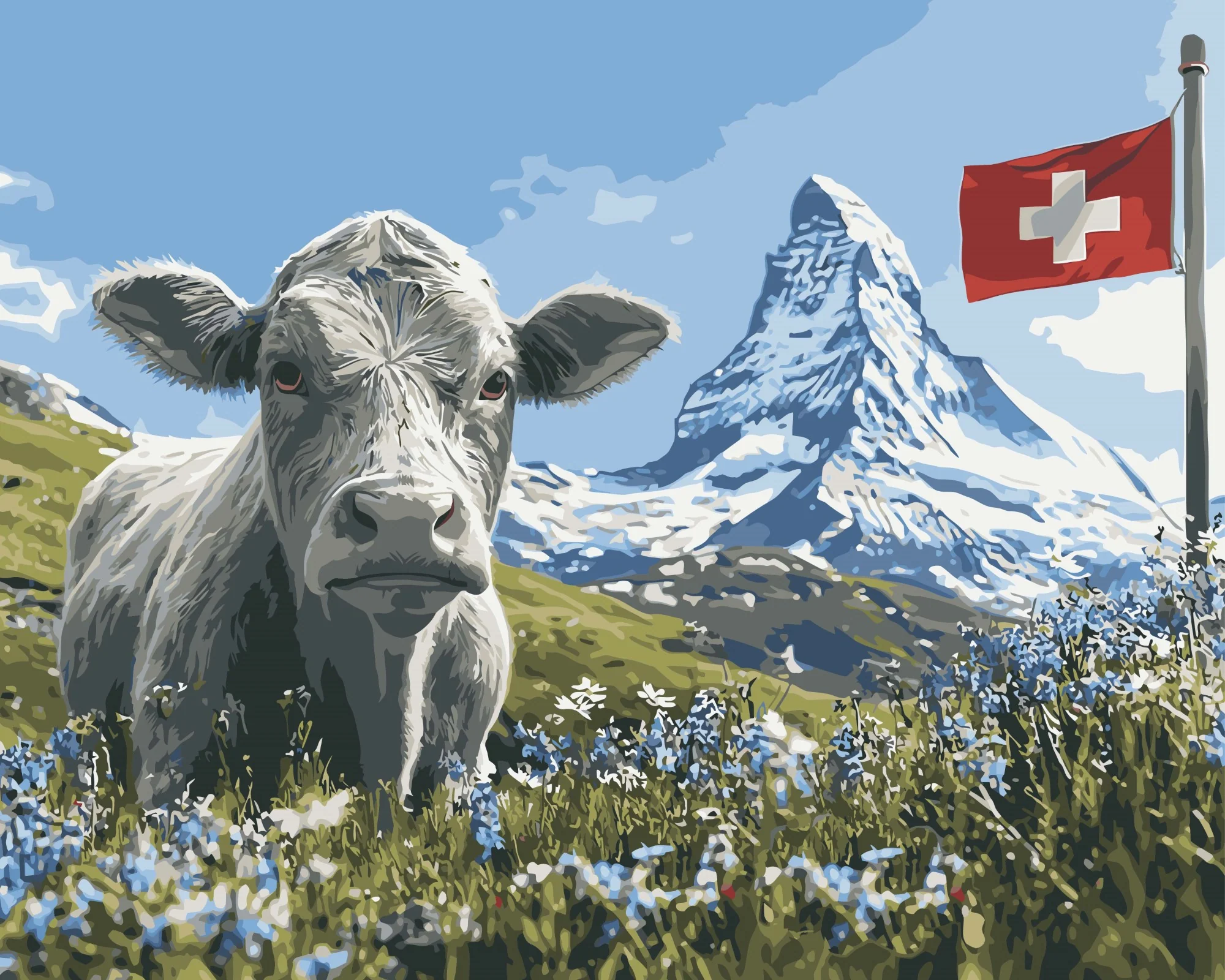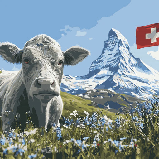 🐄 Design: Una mucca alpina in primo piano, circondata da fiori di montagna, con il Cervino e la bandiera svizzera sullo sfondo. Un’immagine che celebra la natura e le tradizioni elvetiche, perfetta per decorare case di montagna o ambienti rustici.