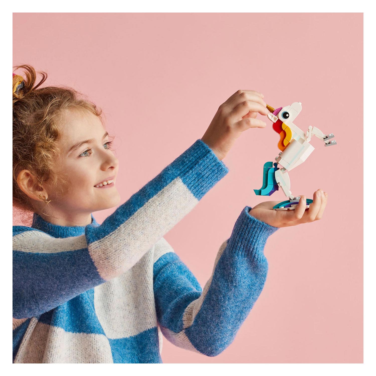 Il set LEGO Creator 3in1 Magical Unicorn (31140) è il modo perfetto per portare i bambini dai 7 anni in su fuori dal mondo reale e in un’avventura mistica e magica. Con questo set possono costruire tre diverse creature magiche. La prima è l’accattivante unicorno arcobaleno con il suo corno dorato, la coda e la criniera colorate e le gambe e gli zoccoli mobili. Ma non è tutto: questo set da 145 pezzi contiene altre due fantastiche strutture! Trasforma il tuo unicorno in un maestoso cavalluccio marino o in un regale pavone in un batter d’occhio. Il cavalluccio marino è dotato di pinne e testa mobili, per potersi muovere liberamente nell’acqua mentre si inventano nuove storie ogni ora. È inoltre possibile utilizzare parti dell’unicorno arcobaleno per costruire un accattivante pavone con occhi e piume della coda mobili! Quando la giornata di gioco finisce, queste incredibili creazioni saranno altrettanto belle da esporre! L’unicorno può posare orgoglioso sul suo supporto decorativo arcobaleno, il cavalluccio marino può riposare su un letto di crepe marine e il pavone può appollaiarsi su due zampe piumate e ammirare la sua bellezza. Questo incredibile set 3in1 non solo regala ore di divertimento immaginativo, ma sviluppa anche le capacità motorie, le abilità di problem solving e la creatività dei bambini. Il magico unicorno misura circa 13 cm. Contiene 145 pezzi.