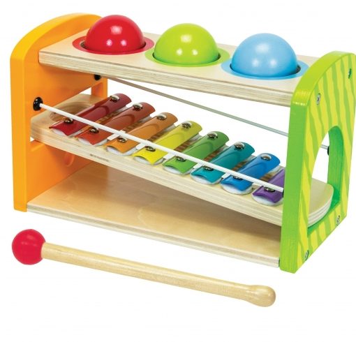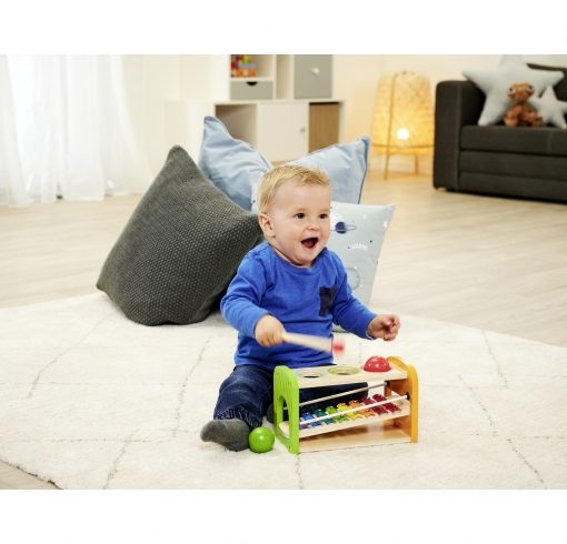 . Il set comprende la panca batte palline da 12,5x25x12 cm con 3 fori colorati, 3 palline colorate e un martello. Adatto a bambini dai 2 anni in su.