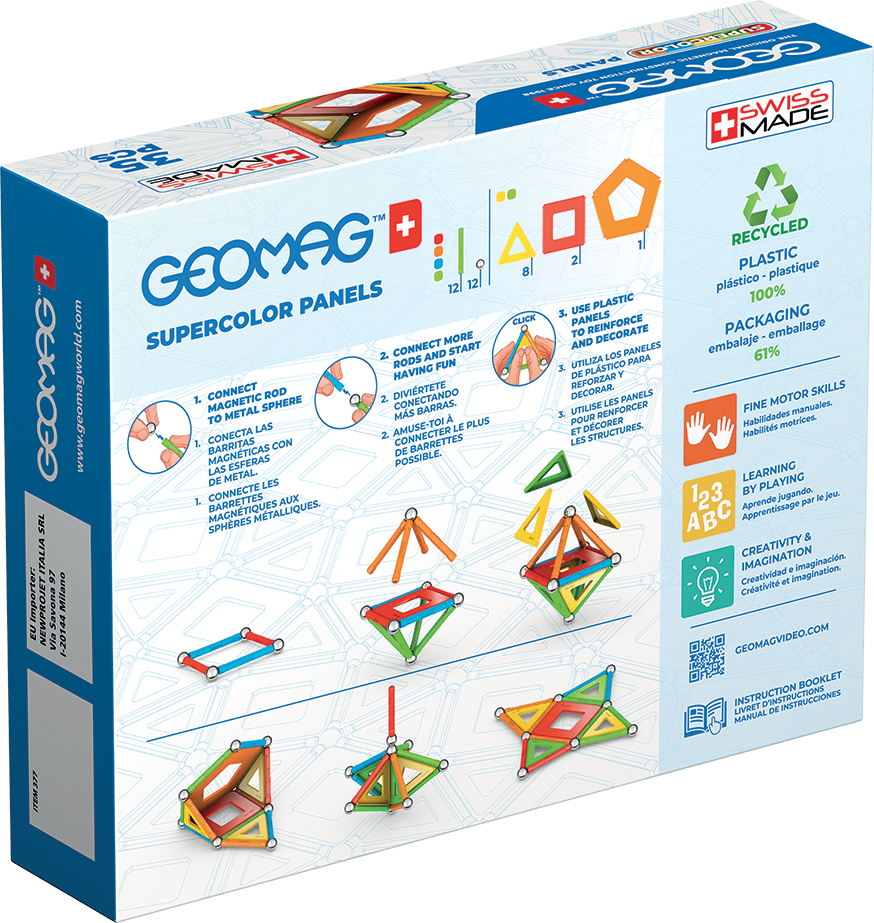 I giocattoli magnetici Geomag favoriscono lo sviluppo sano dei bambini e la conservazione di un ambiente vivibile in cui i nostri figli crescono. Giocare con Geomag migliora la motricità fine, la coordinazione occhio-mano e la concentrazione, nonché le capacità di lettura, scrittura e matematica dei bambini. I bambini imparano ad applicare le loro esperienze nella vita reale. Geomag – Made in Switzerland. Costruire infinite strutture 3D e liberare la creatività e l’immaginazione attraverso i componenti di gioco: Aste magnetiche, sfere d’acciaio e tavolette di varie forme compongono il sistema di costruzioni magnetiche che ha reso Geomag famoso in tutto il mondo. La gamma Classic è composta da diverse linee di prodotti (Colour, Panels, Glitter e Glow) con cui è possibile costruire strutture grandi e stabili. Colori vivaci – forti magneti. Pratica scatola tascabile per riporre le aste e le sfere. Di alta qualità, realizzato in plastica riciclata al 100%. Età: 3 – 99 anni. Contenuto: 12 aste, 12 sfere, 8 pannelli triangolari, 2 pannelli quadrati, 1 pannello pentagonale.