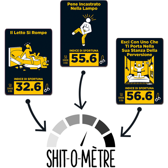 Giocare a Shit Happens – 50 sfumature di sfiga è molto semplice: non devi fare altro che collezionare le carte sulle sfortune assurde relative ai momenti più intimi della tua vita . Rifletti bene con ogni carta e classificala nel modo giusto sullo SHIT-O-METRO, una scala di sfortune assurde relative ai momenti più intimi della tua vita appositamente studiata da un Team di esperti. Posiziona correttamente la carta per vincerla! Quando raggiungi 10 carte hai vinto!