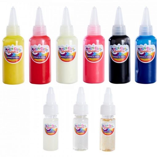 – Contenuto completo: il set contiene 9 flaconi di gel colorato con colori base, colori glitterati e colori con effetto fosforescente, oltre a una ciotola, 6 stampi e 6x additivi per l’acqua.