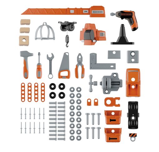 Il set include un’ampia postazione da lavoro con morsa, pannello portautensili e numerosi accessori firmati Black+Decker: martello, cacciavite, sega, chiavi, bulloni e tanto altro.