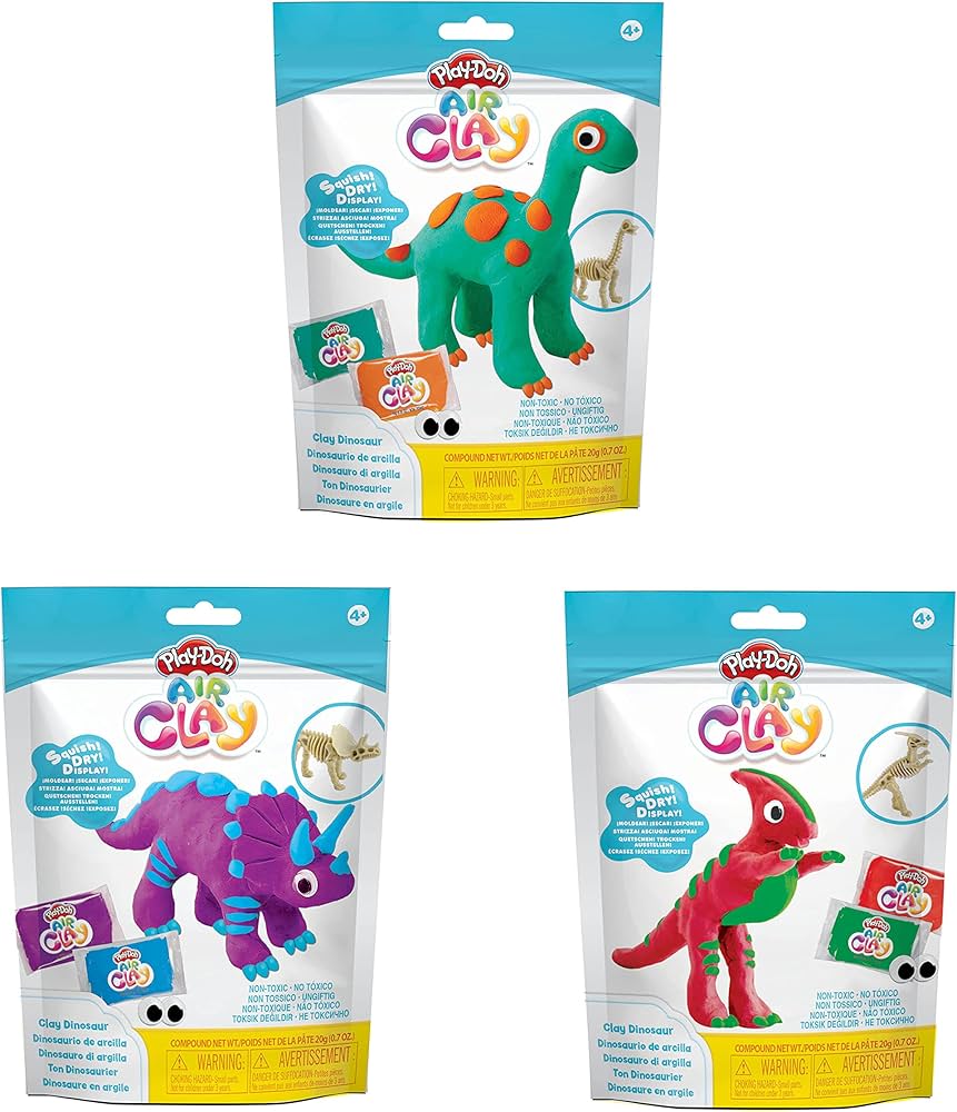 Scopri il gioco magico con Play-Doh Air Clay! Questa straordinaria pasta modellabile permette alla creatività di prendere vita. Con la sua texture liscia e setosa, può essere facilmente modellato senza lasciare residui. La parte migliore è che Play-Doh Air Clay si asciuga all’aria, senza bisogno di un forno. I genitori possono essere contenti perché questa argilla atossica non lascia tracce indesiderate in casa. Semplicemente spremere, arrotolare e modellare non solo sviluppa le capacità motorie delle mani e delle dita, ma stimola anche la creatività. Le opere d’arte restano per sempre senza sgretolarsi. Lascia correre la tua immaginazione con il set di stampi per dinosauri Play-Doh Air Clay. Con due colori di pasta da gioco, una serie di occhi finti e una cornice di fossile di dinosauro, i bambini dai 4 anni in su possono usare le loro capacità motorie complesse per modellare e modellare le creazioni. Copri completamente la cornice del dinosauro o lascia le ossa esposte per creare una creazione davvero unica. Dopo un tempo di asciugatura di 24 ore, i dinosauri prendono vita in avventure di gioco creative. Gli stampi per dinosauri Play-Doh Air Clay sono disponibili in 3 diverse forme di dinosauro. Contenuto: 2 pezzi di argilla aerea, 1 cornice fossile di dinosauro, 1 paio di occhi.
