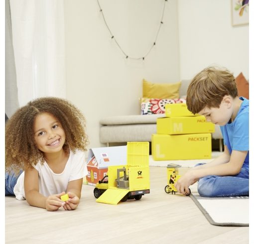Con il dettagliato set di vagoni pacchi DHL, i bambini dai 3 anni in su possono vestire i panni di un vero fattorino, supportato dai suoni appropriati! Per prima cosa i piccoli conducenti si precipitano con il trasportatore elettronico con personaggio giocattolo e pacchi fino al luogo di consegna, dove aprono la porta scorrevole del veicolo portapacchi, suonano il campanello e, dopo aver consegnato il pacco, ricevono la firma del destinatario. Se non è a casa, l’auto a ruota libera si dirige semplicemente al centro di imballaggio più vicino con le luci e il suono tipico di un veicolo elettrico. Lì i bambini depositano i pacchi negli scomparti pieghevoli, caricano l’auto alla stazione di ricarica e nel frattempo prendono la cargo bike per fungere da corriere in bicicletta per consegnare lettere e pacchi.