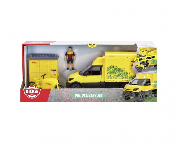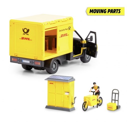 Dickie Toys – Set consegna DHL (25 cm) – Set da gioco per consegna pacchi per bambini dai 3 anni in su, autobus postale DHL con postino, stazione pacchi e bici da carico, auto con luci e suoni, batterie incluse