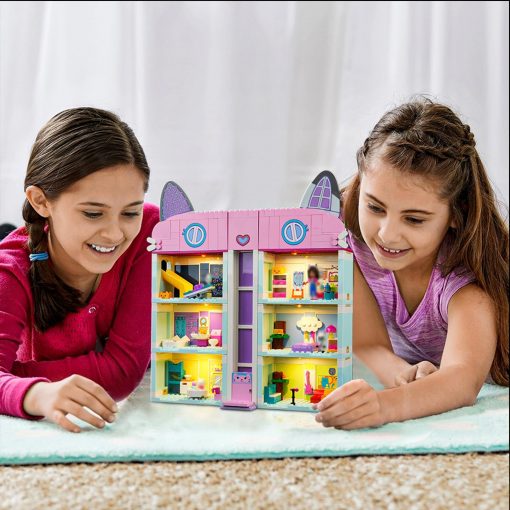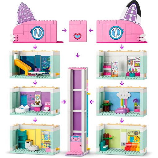La casa delle bambole di Gaby è composta da 8 stanze colorate collegate tra loro da un ascensore scorrevole. Ogni stanza offre molte attività. Il tuo bambino può, ad esempio, preparare una torta in cucina, giocare sullo scivolo nella sala giochi, dare sfogo alla sua creatività nella sala artistica, suonare il piano nella sala musica, lavarsi in bagno, fare un pisolino in camera da letto o festeggiare su una pista da ballo rotante sul tetto. Gabby, Pandy, Kuchi e i gattini marini della serie TV invitano il tuo bambino a vivere tante avventure. Una storia illustrata funge da istruzioni di montaggio. E nell’app LEGO Builder troverai funzioni intuitive per ingrandire e ruotare le viste digitali dei modelli. Inoltre, l’elemento di costruzione iniziale garantisce un grande divertimento di costruzione in pochissimo tempo.