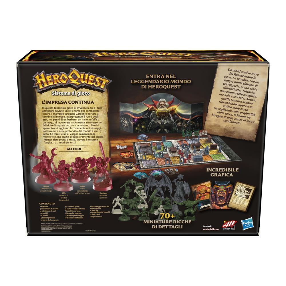 In HeroQuest, gli eroi collaborano per portare a termine imprese epiche, trovare tesori e sconfiggere le forze del male, il tutto in stile Dungeon Crawler. In questo gioco da tavolo semi-cooperativo, un giocatore ricoprirà il ruolo di Zargon, il Game Master, mentre 4 eroi mitici (un barbaro, un nano, un’elfa e un mago) dovranno affrontare avventure in un labirinto pieno di mostri e spaventose segrete oscure. I giocatori potranno immergersi nel mondo fantasy di HeroQuest con meravigliosi disegni e oltre 65 miniature dettagliate. Il gioco include 14 scenari e ha un’infinita rigiocabilità poiché i giocatori possono creare le proprie storie. Riunisci gli amici per serate di gioco all’insegna di un’epica battaglia del bene contro il male. Il gioco è per 2-5 giocatori, dai 14 anni in su. Avalon Hill e tutti i marchi e loghi correlati sono marchi commerciali di Hasbro, Inc.