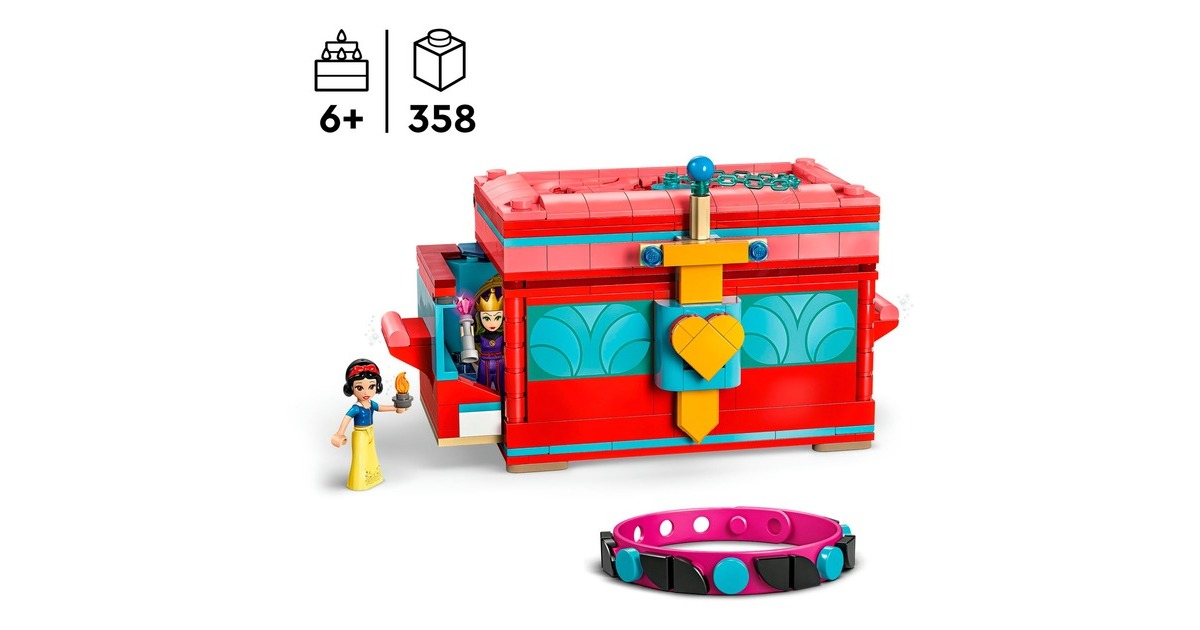 Il Portagioie di Biancaneve Disney (43276) è un regalo fantastico per i bambini e i fan Disney dai 6 anni in su. Il giocattolo artigianale comprende una scatola con coperchio a cerniera, serratura a catena con spada e maniglie su entrambi i lati per estrarre le stanze nascoste. Le due figure LEGO ? Disney – Biancaneve e la Regina Cattiva – invitano a giocare. Si può anche decorare un braccialetto colorato con tanti elementi decorativi e indossarlo. Quando i bambini giocano con le stanze segrete di questo gioco di costruzioni Disney e decorano il braccialetto secondo le proprie idee, sviluppano una maggiore fiducia in se stessi. Il giocattolo Biancaneve può anche essere combinato meravigliosamente con gli altri set di costruzioni LEGO ? Disney disponibili separatamente. Sia i bambini che gli adulti saranno entusiasti di questo dettagliato set di costruzioni. Si divertiranno a mettere insieme questo affascinante regalo Disney. L’app LEGO Builder offre un’esperienza di costruzione facile e intuitiva. Nell’app, i bambini possono ingrandire e ruotare le viste 3D dei modelli, salvare i set e tenere traccia dei loro progressi di costruzione. Il portagioie misura 11 cm di altezza, 17 cm di larghezza e 10 cm di profondità. Contiene 358 pezzi.