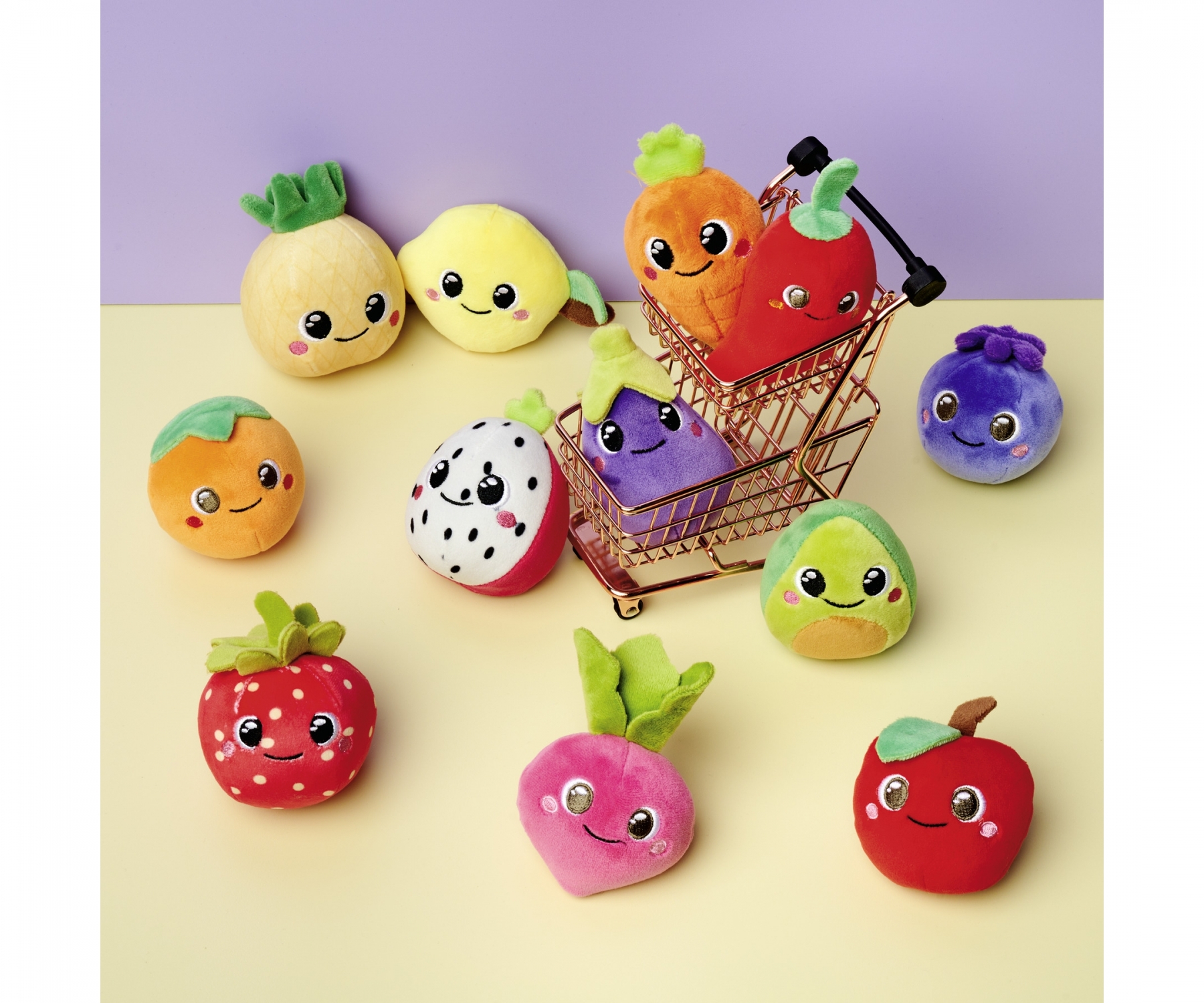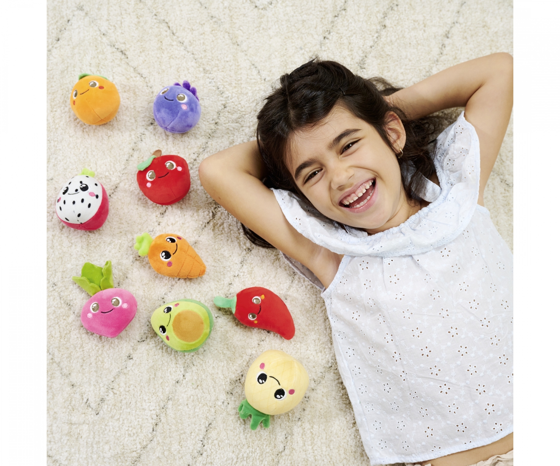 – Vari amici della frutta e della verdura – La collezione offre 12 diversi peluche che i bambini possono collezionare, scambiare e portare con sé ovunque vadano. Grazie al materiale particolarmente morbido e alle dimensioni compatte, i piccoli peluche si adattano perfettamente a borse e zaini, ideali per i viaggi!