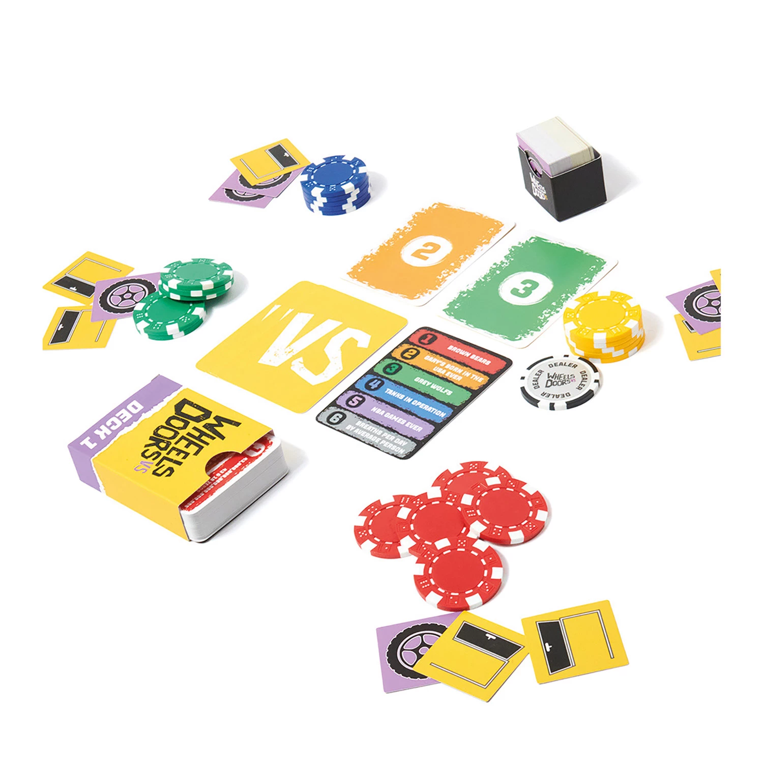 Contenuto: 144 carte Categorie – 24 gettoni in 6 colori – 1 gettone Mazziere – 50 tessere Ruota – 50 tessere Porta – 1 manuale istruzioni.